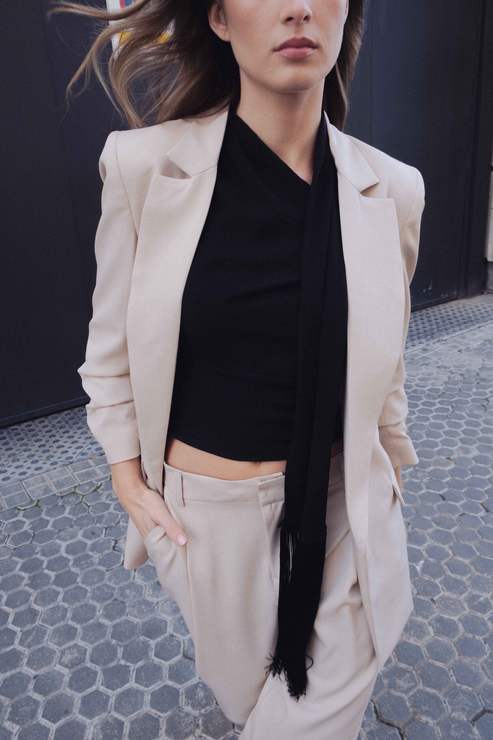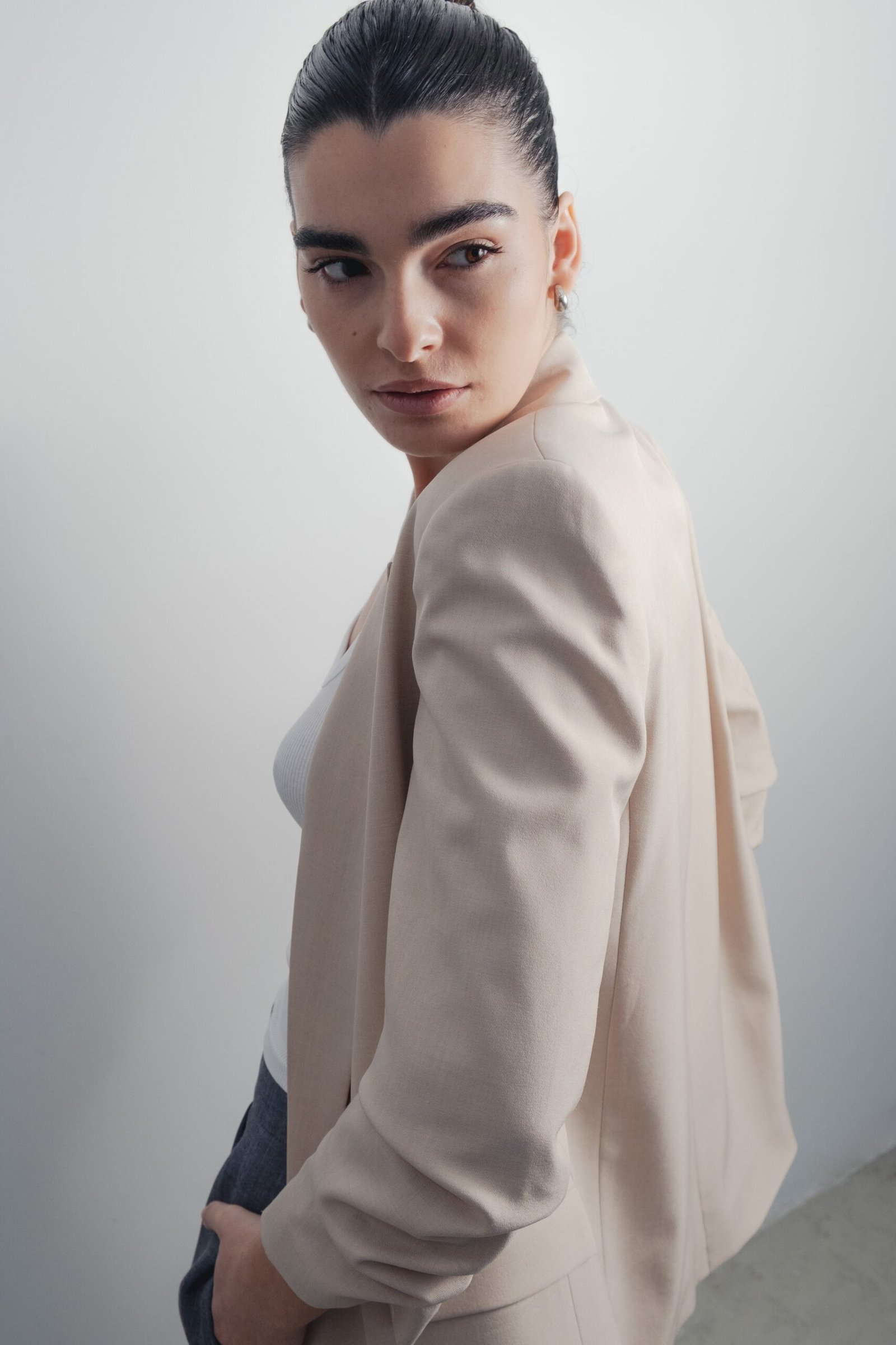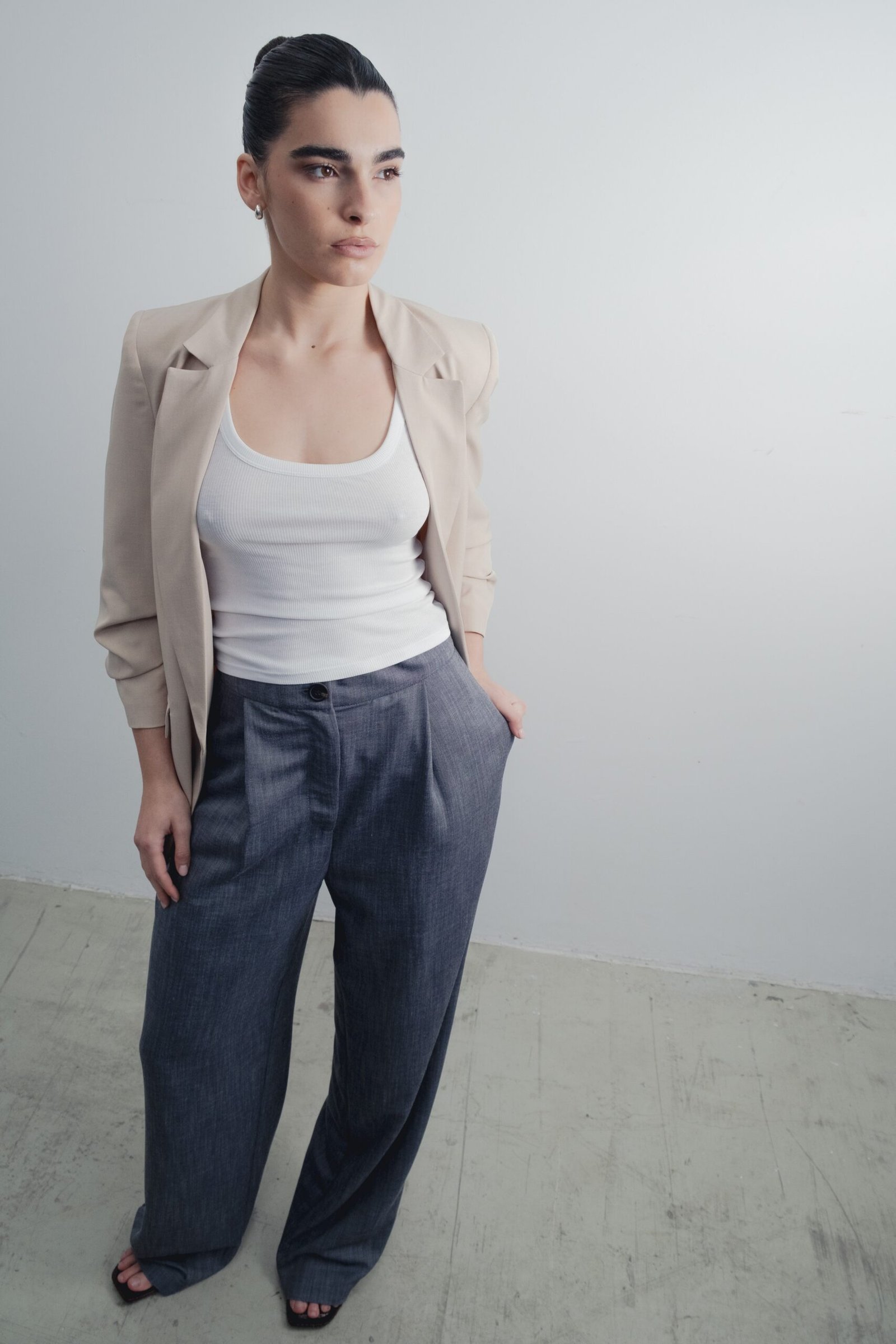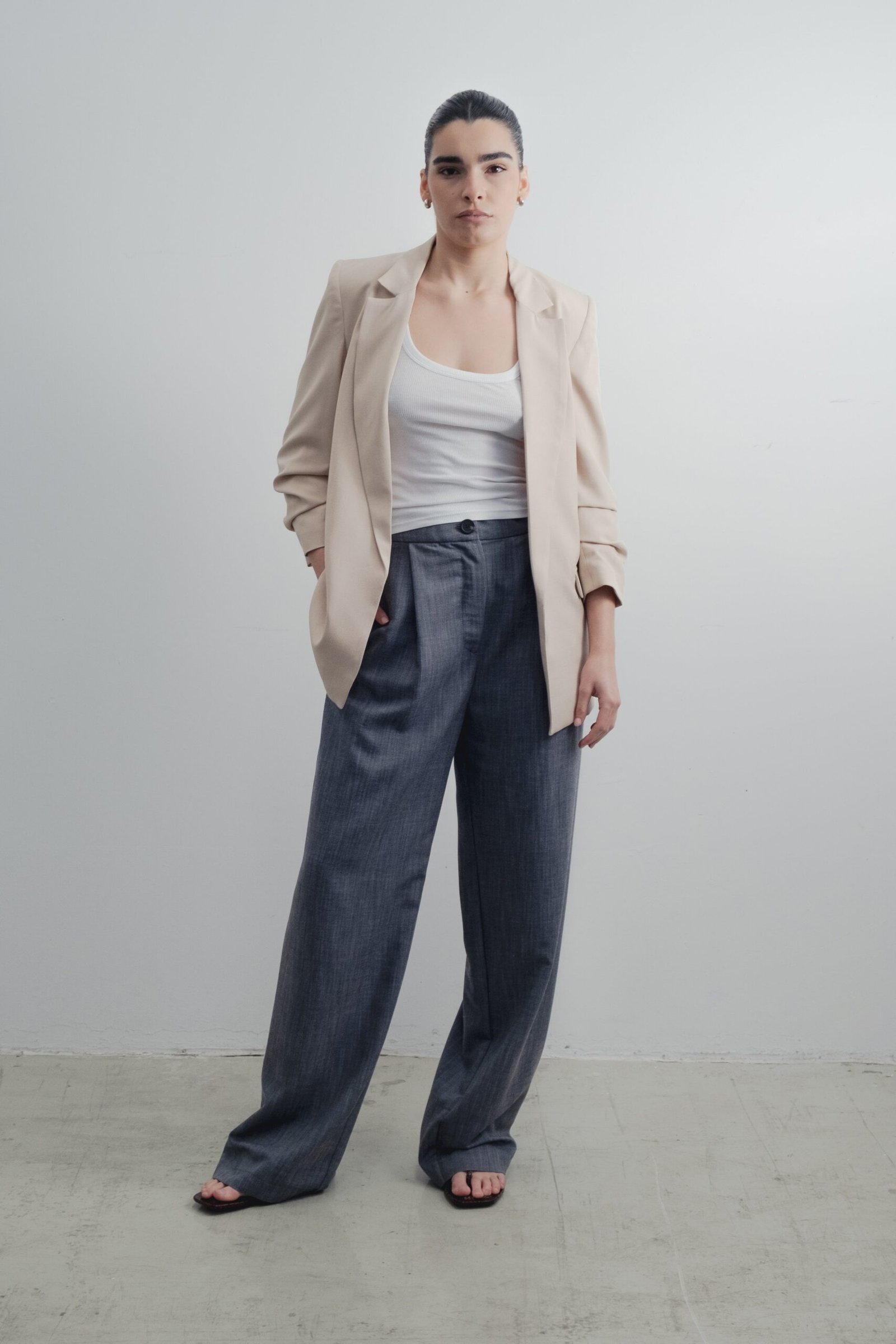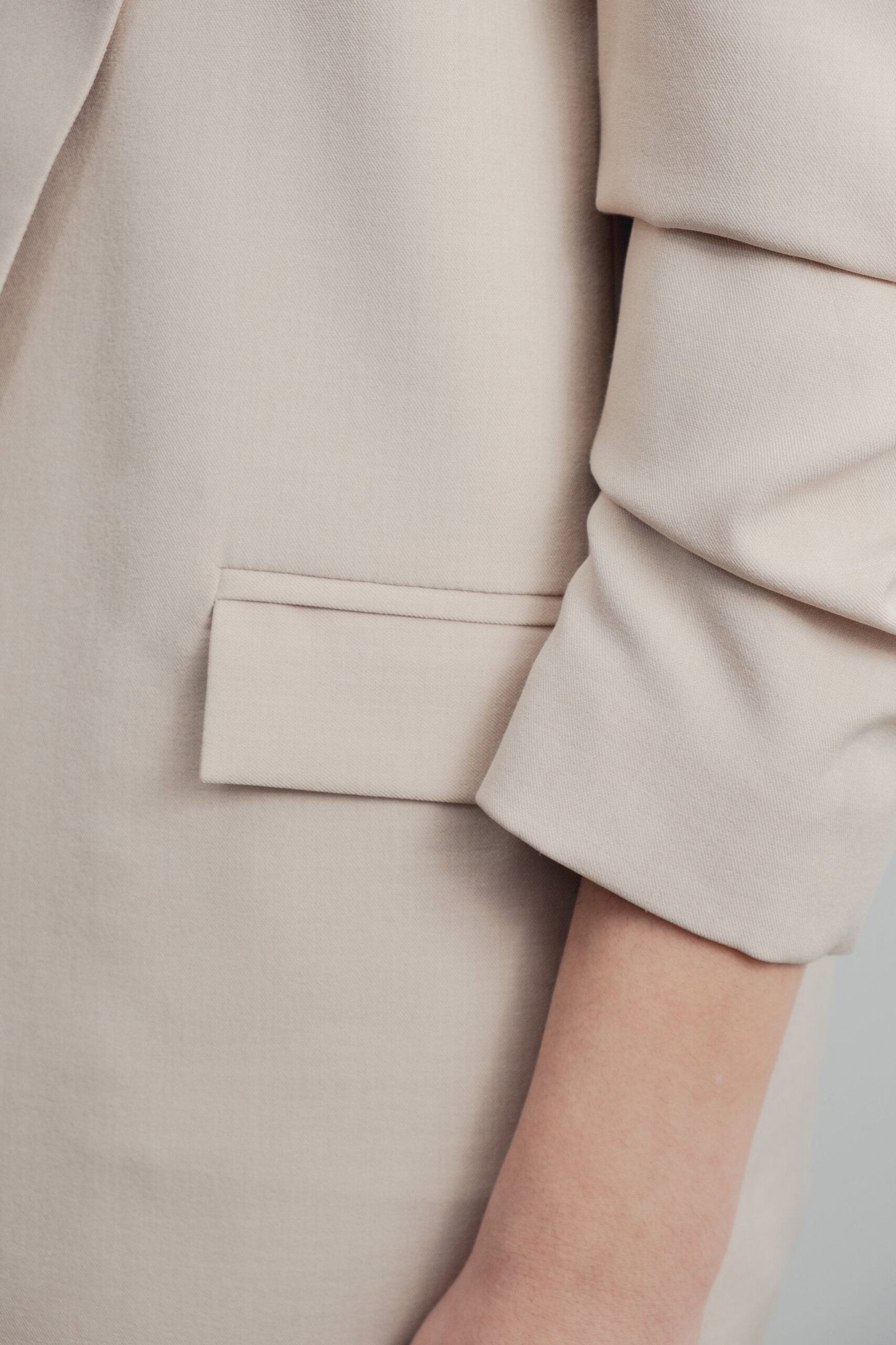 Blazer abierta de cuello solapa y hombreras. Manga remangada por debajo del codo mediante pliegues. Bolsillos delanteros con solapa.