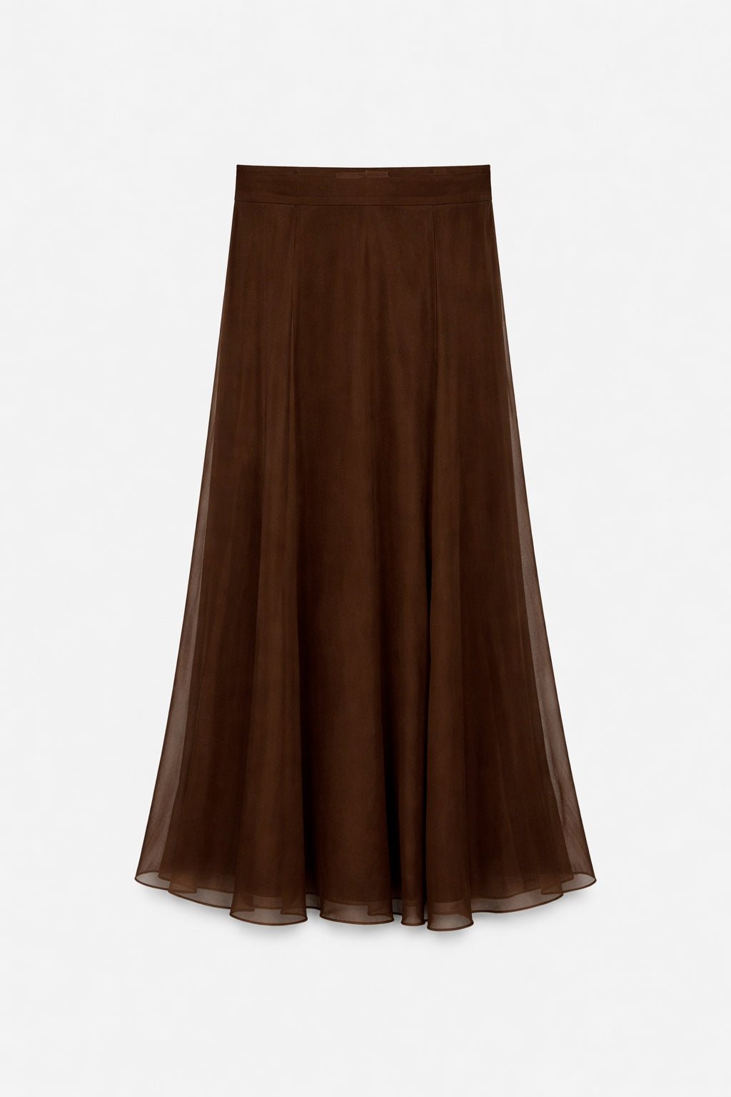 Falda larga de tiro medio y bajo acabado en línea evasé. Cierre con cremallera oculta en costura.