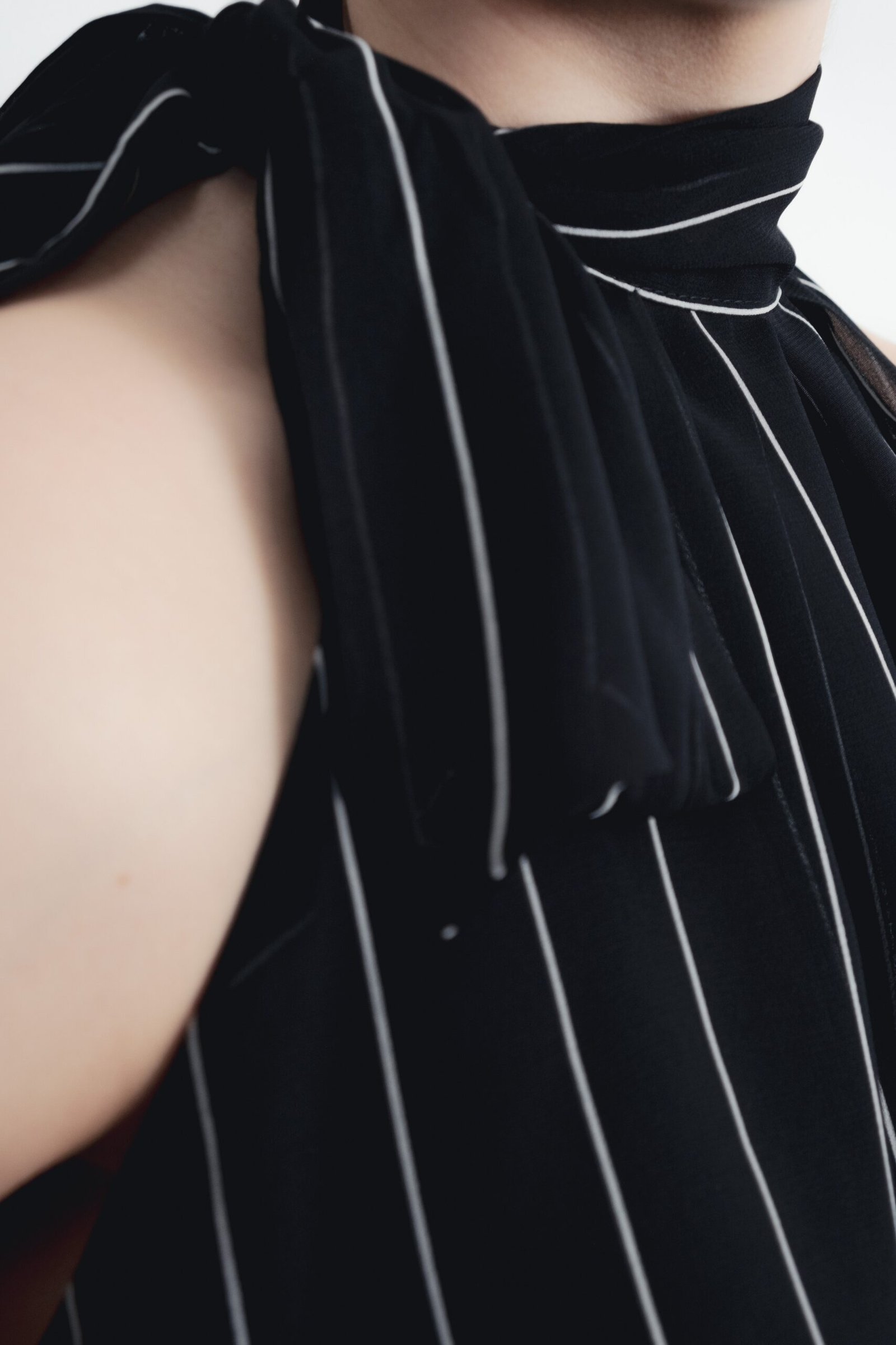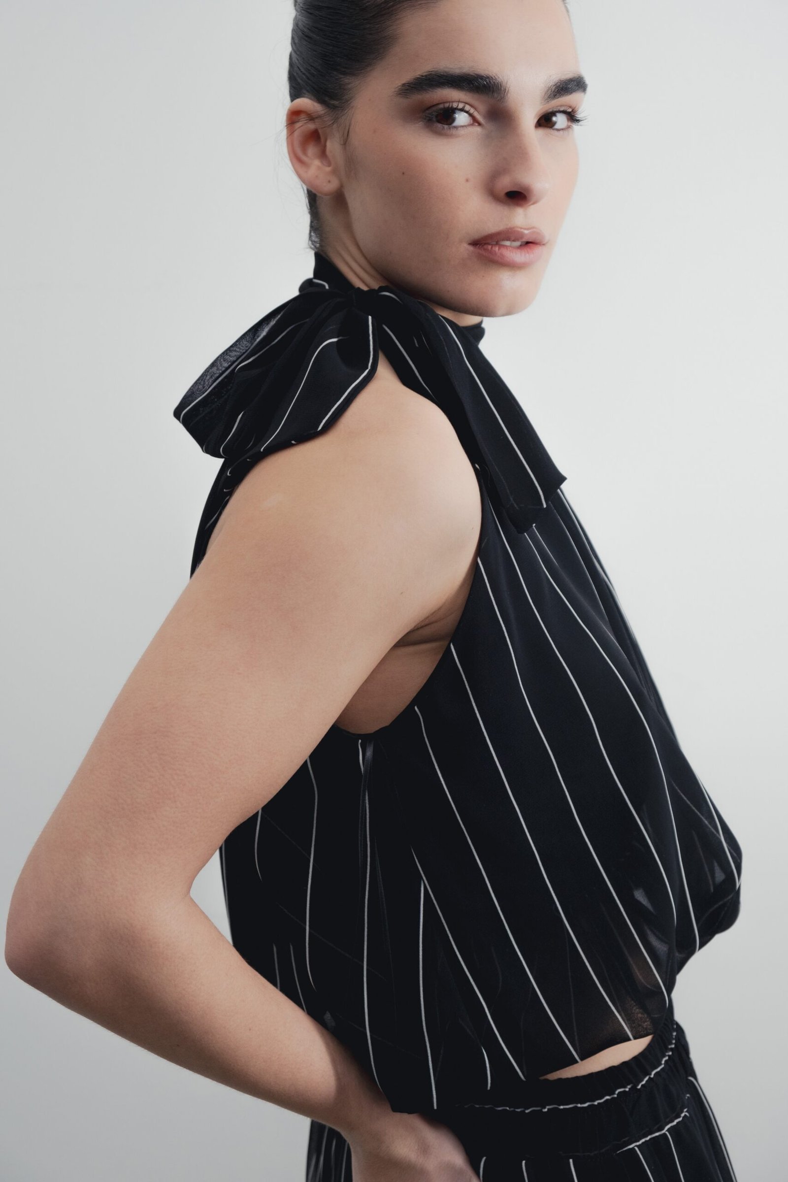 Top de cuello subido con lazo y manga sisa. Bajo abullonado con elástico interior.