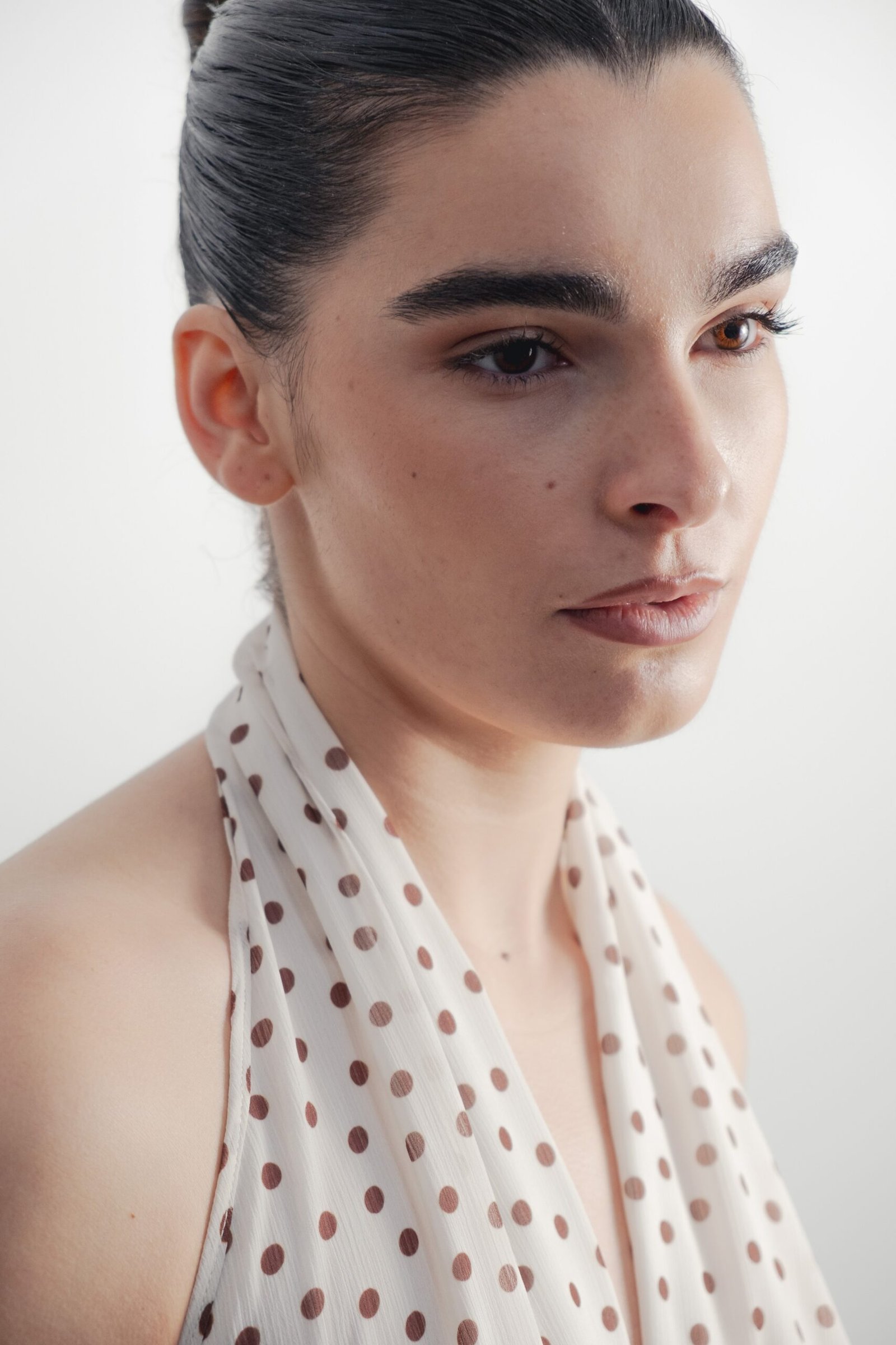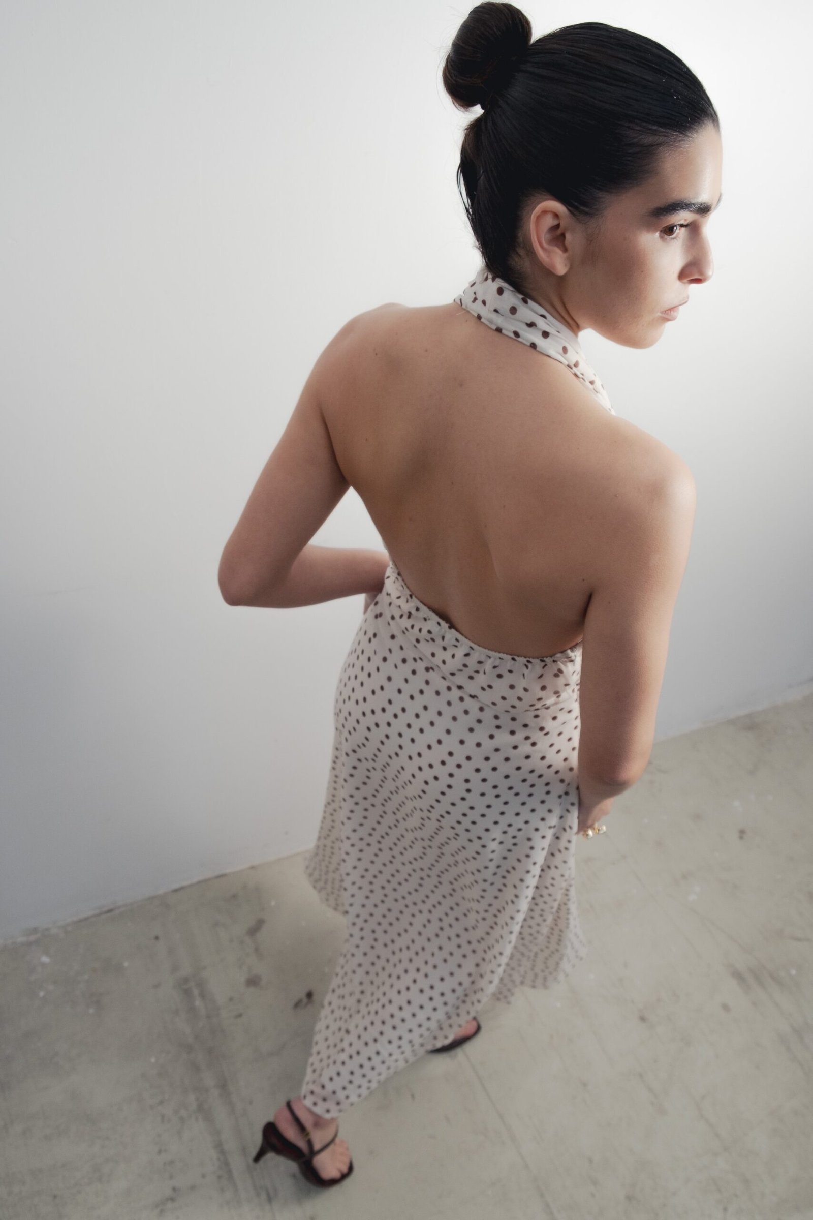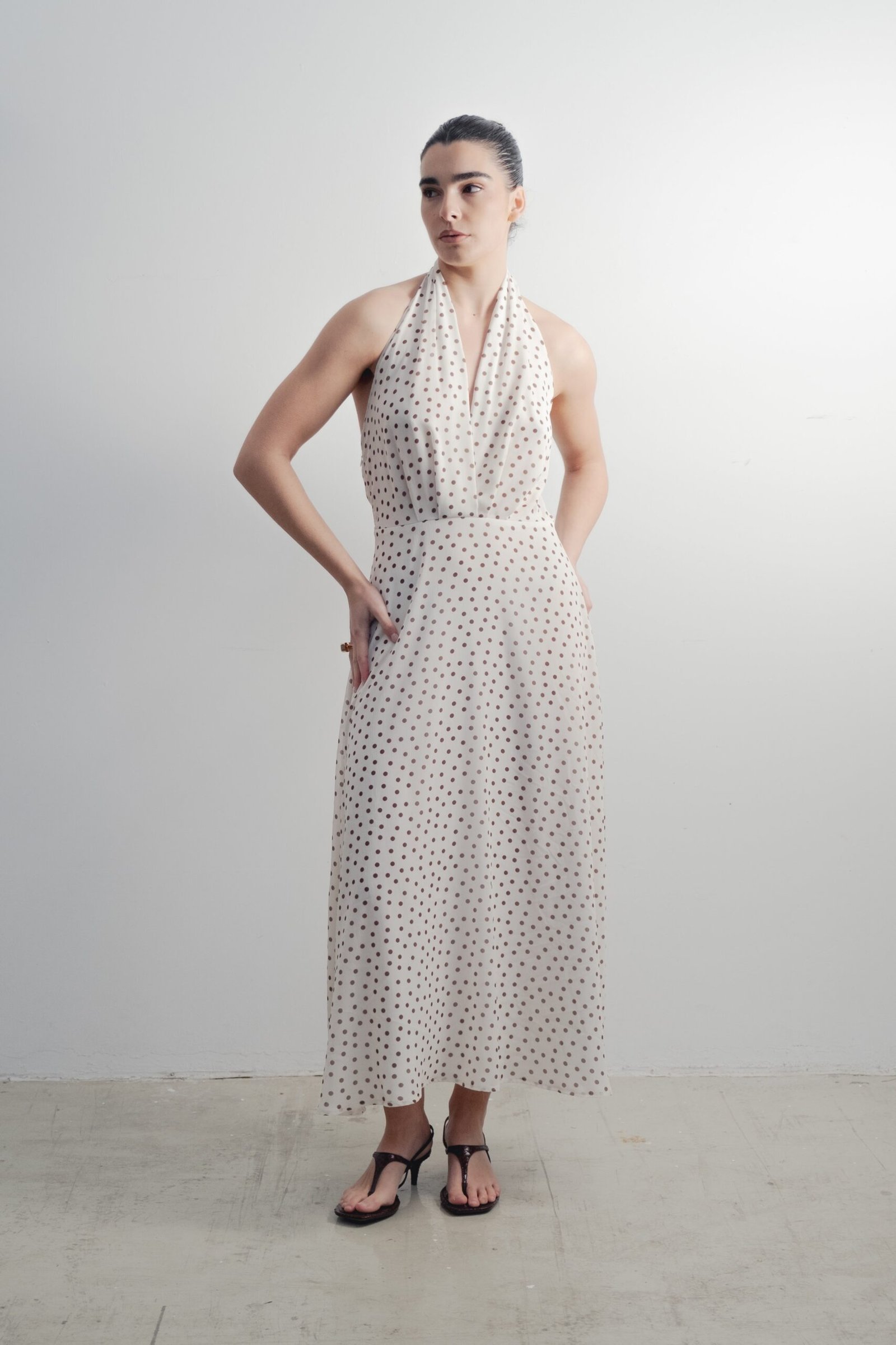 Vestido largo con cuello halter y escote pico pronunciado. Detalle de pinzas. Forro interior combinado. Cierre con cremallera oculta en costura.